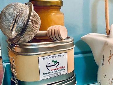 Any two selected 2.5 oz Signature tea blends, Raw Honey and tea accessories make this a Brewteaful Gift for a tea connoisseur