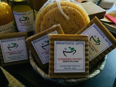 Our Turmeric Honey Gift Set, as with all our product, this collection includes a Brewtea Bar, Body Wash, Body Oil, Exfoliating Scrub that is helpful for hyperpigmentation, anti-aging, inflammation and skin issues also all natural. Look forward to a natural, Brewteafully healthy glow and anti-aging effects after continuous use
